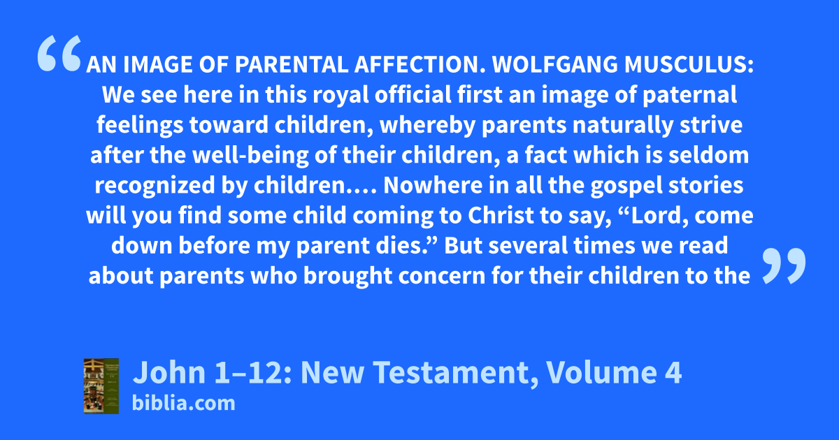 AN IMAGE OF PARENTAL AFFECTION. WOLFGANG MUSCULUS: We see here in this royal official first an image of paternal feelings toward children, whereby parents naturally strive after the well-being of their children, a fact which is seldom recognized by children.… Nowhere in all the gospel stories will you find some child coming to Christ to say, “Lord, come down before my parent dies.” But several times we read about parents who brought concern for their children to the