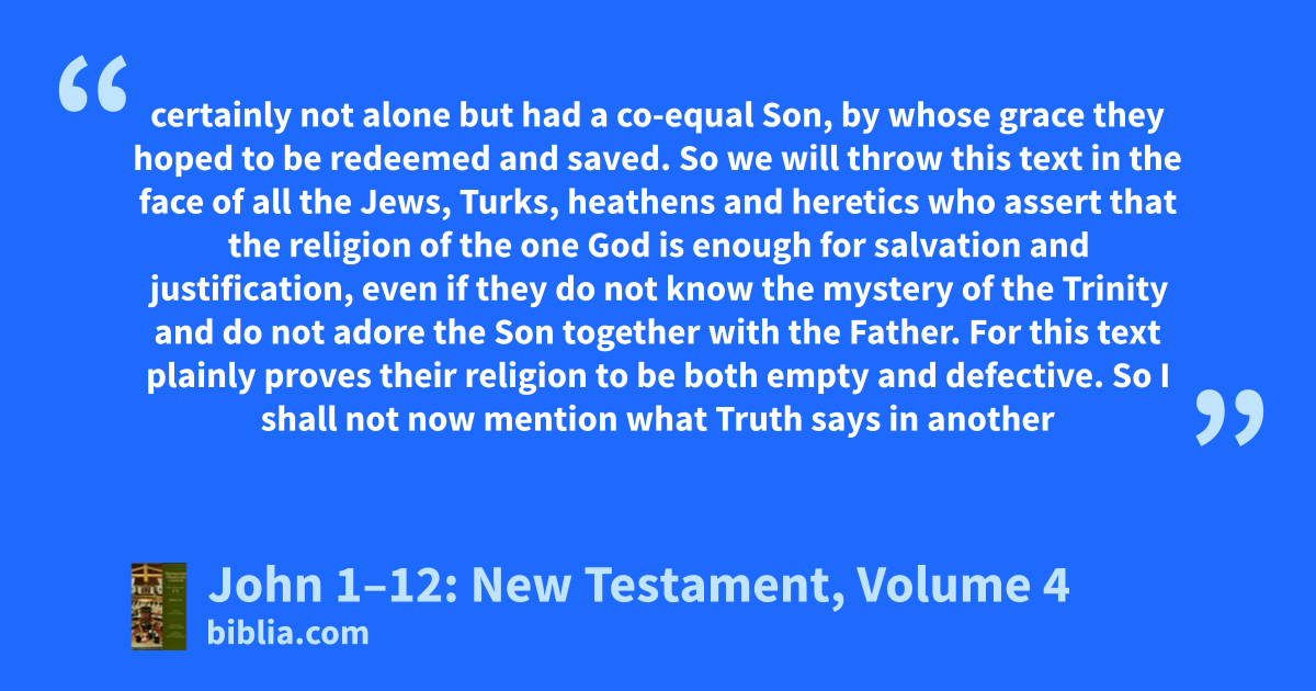 certainly not alone but had a co-equal Son, by whose grace they hoped to be redeemed and saved. So we will throw this text in the face of all the Jews, Turks, heathens and heretics who assert that the religion of the one God is enough for salvation and justification, even if they do not know the mystery of the Trinity and do not adore the Son together with the Father. For this text plainly proves their religion to be both empty and defective. So I shall not now mention what Truth says in another