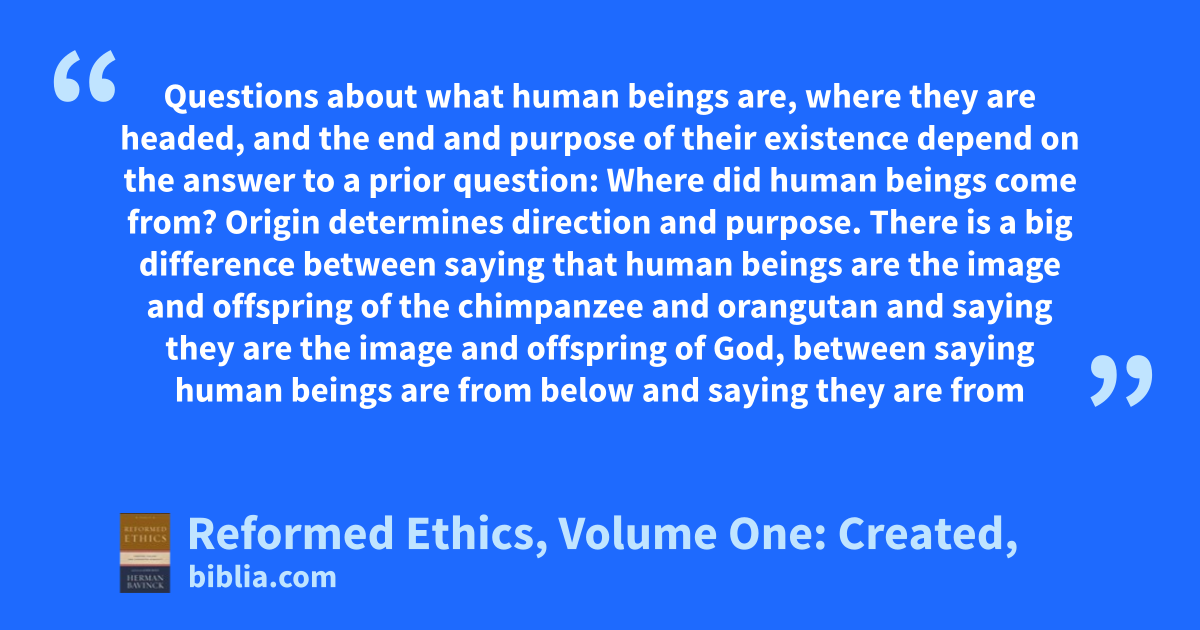 Questions about what human beings are, where they are headed, and the end and purpose of their existence depend on the answer to a prior question: Where did human beings come from? Origin determines direction and purpose. There is a big difference between saying that human beings are the image and offspring of the chimpanzee and orangutan and saying they are the image and offspring of God, between saying human beings are from below and saying they are from