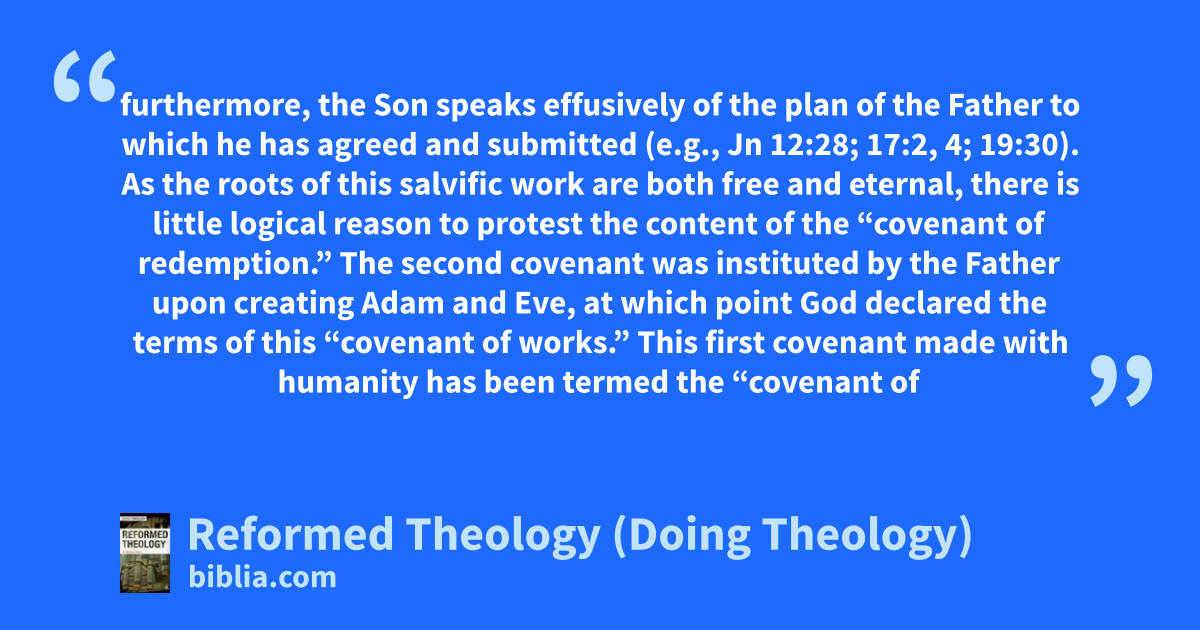 furthermore, the Son speaks effusively of the plan of the Father to which he has agreed and submitted (e.g., Jn 12:28; 17:2, 4; 19:30). As the roots of this salvific work are both free and eternal, there is little logical reason to protest the content of the “covenant of redemption.” The second covenant was instituted by the Father upon creating Adam and Eve, at which point God declared the terms of this “covenant of works.” This first covenant made with humanity has been termed the “covenant of