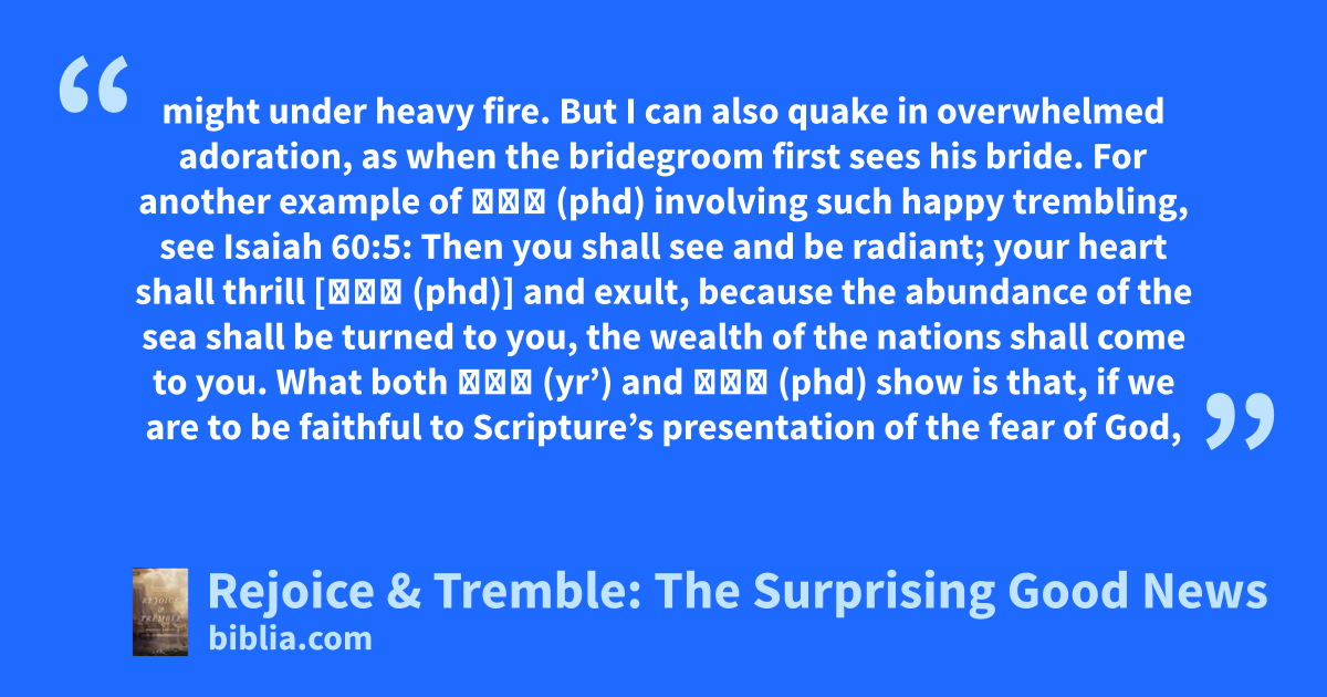 might under heavy fire. But I can also quake in overwhelmed adoration, as when the bridegroom first sees his bride. For another example of פחד (phd) involving such happy trembling, see Isaiah 60:5: Then you shall see and be radiant; your heart shall thrill [פחד (phd)] and exult, because the abundance of the sea shall be turned to you, the wealth of the nations shall come to you. What both ירא (yr’) and פחד (phd) show is that, if we are to be faithful to Scripture’s presentation of the fear of God,