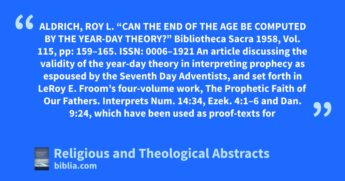 ALDRICH, ROY L. “CAN THE END OF THE AGE BE COMPUTED BY THE YEAR-DAY THEORY?” Bibliotheca Sacra 1958, Vol. 115, pp: 159–165. ISSN: 0006–1921 An article discussing the validity of the year-day theory in interpreting prophecy as espoused by the Seventh Day Adventists, and set forth in LeRoy E. Froom’s four-volume work, The Prophetic Faith of Our Fathers. Interprets Num. 14:34, Ezek. 4:1–6 and Dan. 9:24, which have been used as proof-texts for