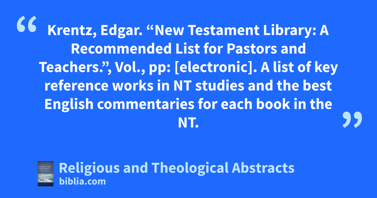 Krentz, Edgar. “New Testament Library: A Recommended List for Pastors and Teachers.”, Vol., pp: [electronic]. A list of key reference works in NT studies and the best English commentaries for each book in the NT.