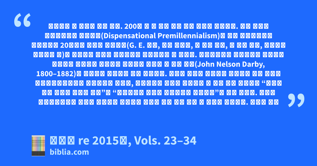 천년설은 그 역사가 길지 않다. 200년 도 채 되지 않는 신종 학설에 불과하다. 물론 우리는 세대주의적인 전천년설(Dispensational Premillennialism)과 초대 교부들로부터 시작되었고 20세기의 수많은 신학자들(G. E. 래드, 웨인 그루덤, 박 형룡 박사, 정 성욱 박사, 크레이그 블롬버그 등)이 대변하는 역사적 전천년설을 혼동해서는 안 되겠다. 세대주의라는 신학체계는 아일랜드 출신으로 플리머스 형제단의 지도자가 되었던 존 넬슨 다비(John Nelson Darby, 1800–1882)의 가르침과 저작들을 통해 등장했다. 필자가 종말론 교과서로 사용하고 있는 안토니 후크마의『개혁주의 종말론』에 의하면, 세대주의적 사고를 결정짓는 두 개의 기본 원리들은 “예언에 대한 문자적 해석을 고집”과 “이스라엘과 교회가 근본적으로 구별된다”고 하는 점이다. 그리고 세대주의자들은 인류를 다루시는 하나님의 계획을 일곱 세대 내지 네 세대로 나누었다. 그래서 이들