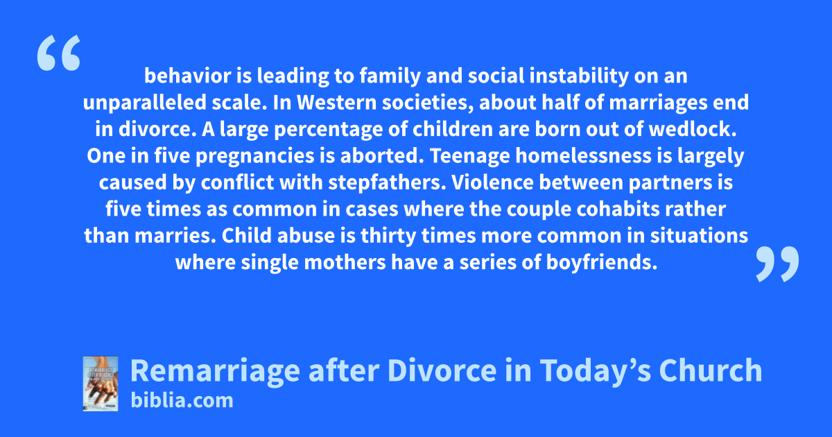 behavior is leading to family and social instability on an unparalleled scale. In Western societies, about half of marriages end in divorce. A large percentage of children are born out of wedlock. One in five pregnancies is aborted. Teenage homelessness is largely caused by conflict with stepfathers. Violence between partners is five times as common in cases where the couple cohabits rather than marries. Child abuse is thirty times more common in situations where single mothers have a series of boyfriends.