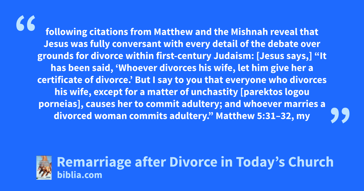following citations from Matthew and the Mishnah reveal that Jesus was fully conversant with every detail of the debate over grounds for divorce within first-century Judaism: [Jesus says,] “It has been said, ‘Whoever divorces his wife, let him give her a certificate of divorce.’ But I say to you that everyone who divorces his wife, except for a matter of unchastity [parektos logou porneias], causes her to commit adultery; and whoever marries a divorced woman commits adultery.” Matthew 5:31–32, my