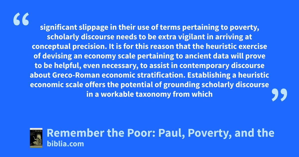 significant slippage in their use of terms pertaining to poverty, scholarly discourse needs to be extra vigilant in arriving at conceptual precision. It is for this reason that the heuristic exercise of devising an economy scale pertaining to ancient data will prove to be helpful, even necessary, to assist in contemporary discourse about Greco-Roman economic stratification. Establishing a heuristic economic scale offers the potential of grounding scholarly discourse in a workable taxonomy from which
