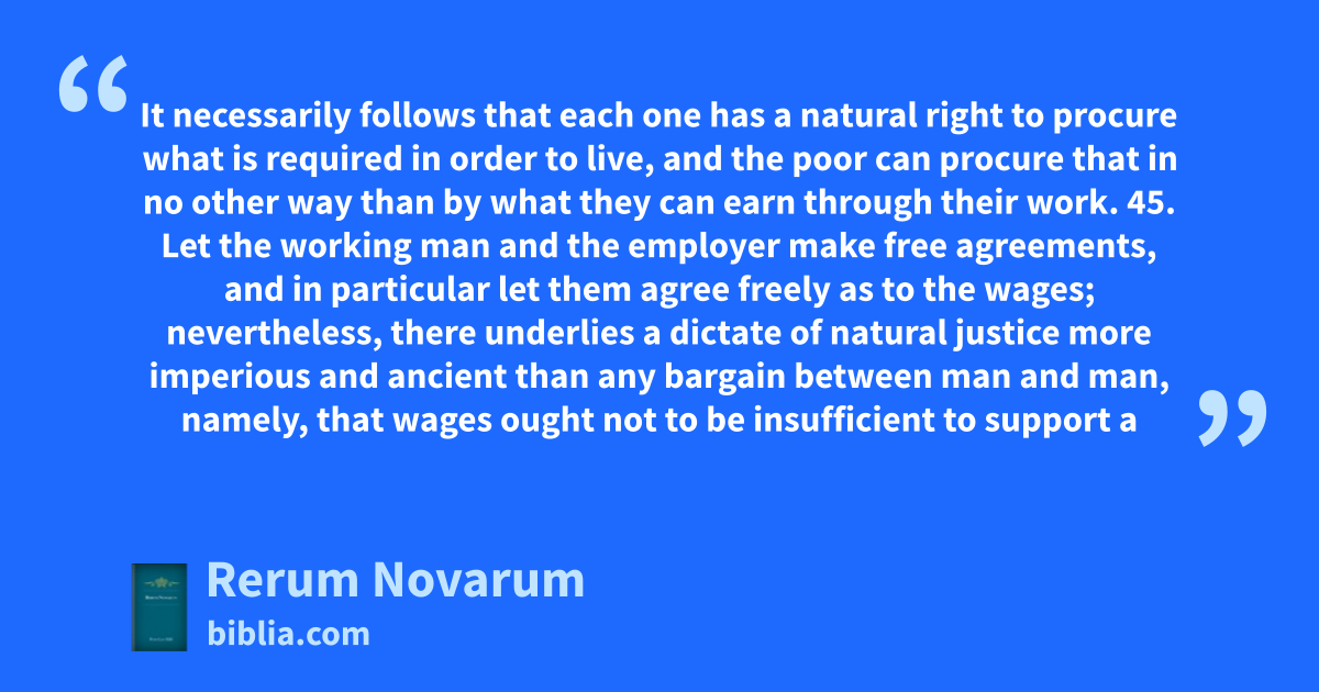 It necessarily follows that each one has a natural right to procure what is required in order to live, and the poor can procure that in no other way than by what they can earn through their work. 45. Let the working man and the employer make free agreements, and in particular let them agree freely as to the wages; nevertheless, there underlies a dictate of natural justice more imperious and ancient than any bargain between man and man, namely, that wages ought not to be insufficient to support a