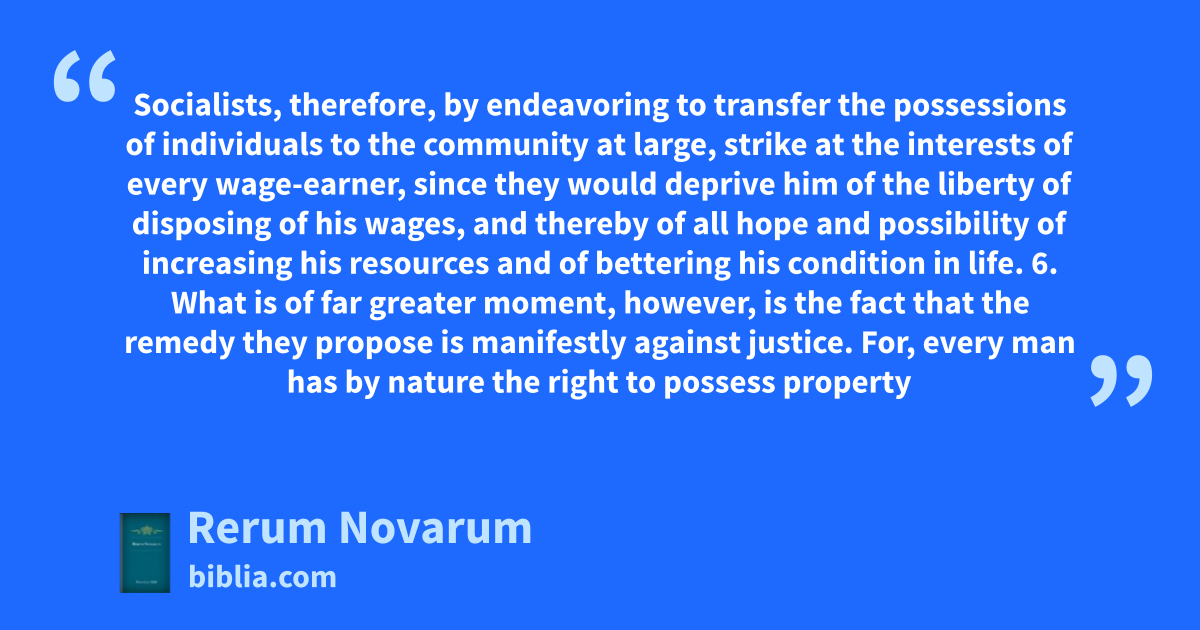 Socialists, therefore, by endeavoring to transfer the possessions of individuals to the community at large, strike at the interests of every wage-earner, since they would deprive him of the liberty of disposing of his wages, and thereby of all hope and possibility of increasing his resources and of bettering his condition in life. 6. What is of far greater moment, however, is the fact that the remedy they propose is manifestly against justice. For, every man has by nature the right to possess property