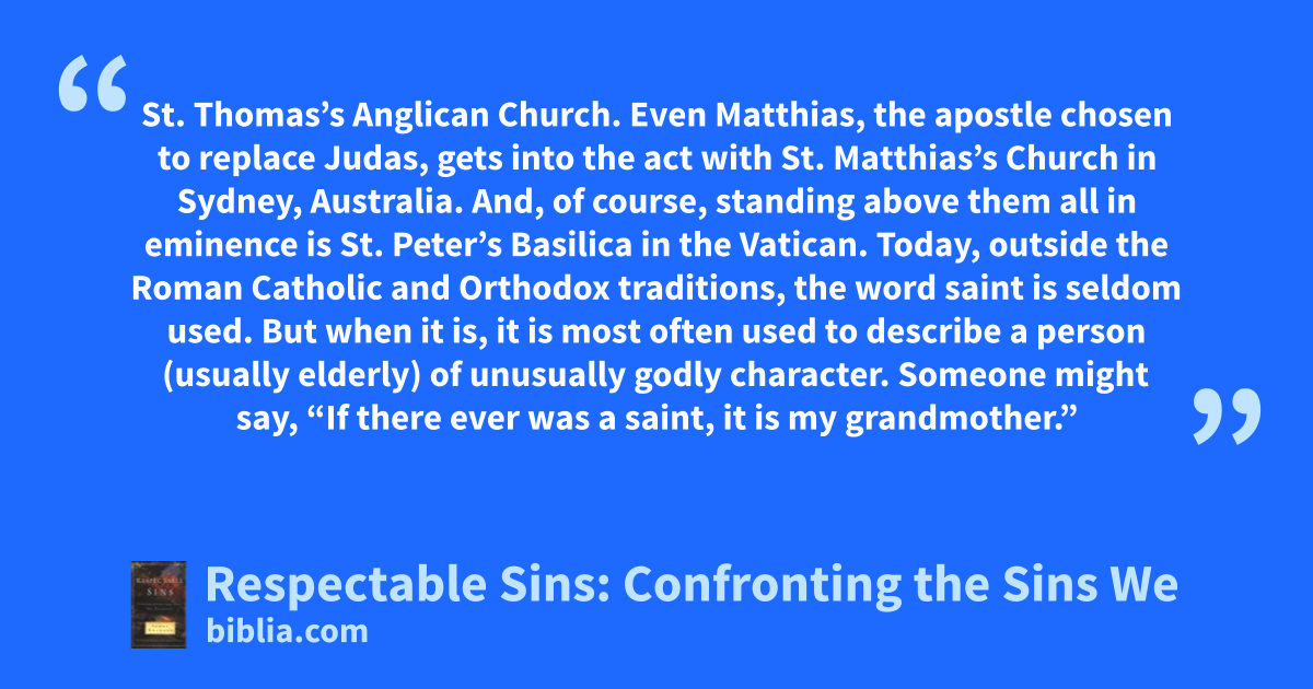 St. Thomas’s Anglican Church. Even Matthias, the apostle chosen to replace Judas, gets into the act with St. Matthias’s Church in Sydney, Australia. And, of course, standing above them all in eminence is St. Peter’s Basilica in the Vatican. Today, outside the Roman Catholic and Orthodox traditions, the word saint is seldom used. But when it is, it is most often used to describe a person (usually elderly) of unusually godly character. Someone might say, “If there ever was a saint, it is my grandmother.”