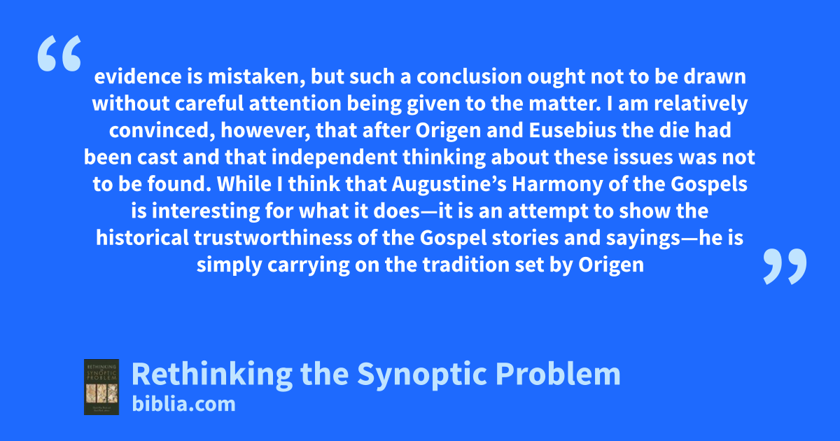 evidence is mistaken, but such a conclusion ought not to be drawn without careful attention being given to the matter. I am relatively convinced, however, that after Origen and Eusebius the die had been cast and that independent thinking about these issues was not to be found. While I think that Augustine’s Harmony of the Gospels is interesting for what it does—it is an attempt to show the historical trustworthiness of the Gospel stories and sayings—he is simply carrying on the tradition set by Origen
