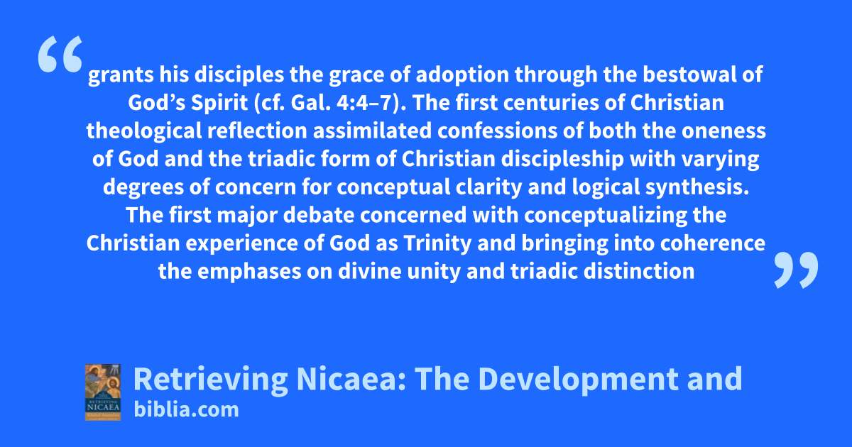 grants his disciples the grace of adoption through the bestowal of God’s Spirit (cf. Gal. 4:4–7). The first centuries of Christian theological reflection assimilated confessions of both the oneness of God and the triadic form of Christian discipleship with varying degrees of concern for conceptual clarity and logical synthesis. The first major debate concerned with conceptualizing the Christian experience of God as Trinity and bringing into coherence the emphases on divine unity and triadic distinction