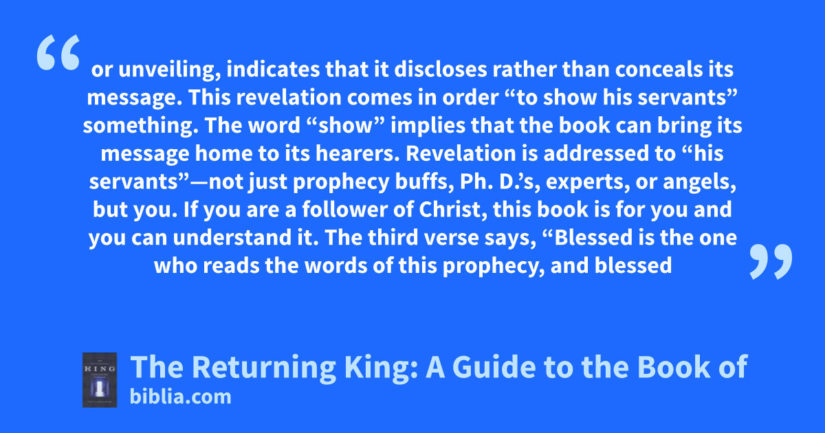 or unveiling, indicates that it discloses rather than conceals its message. This revelation comes in order “to show his servants” something. The word “show” implies that the book can bring its message home to its hearers. Revelation is addressed to “his servants”—not just prophecy buffs, Ph. D.’s, experts, or angels, but you. If you are a follower of Christ, this book is for you and you can understand it. The third verse says, “Blessed is the one who reads the words of this prophecy, and blessed