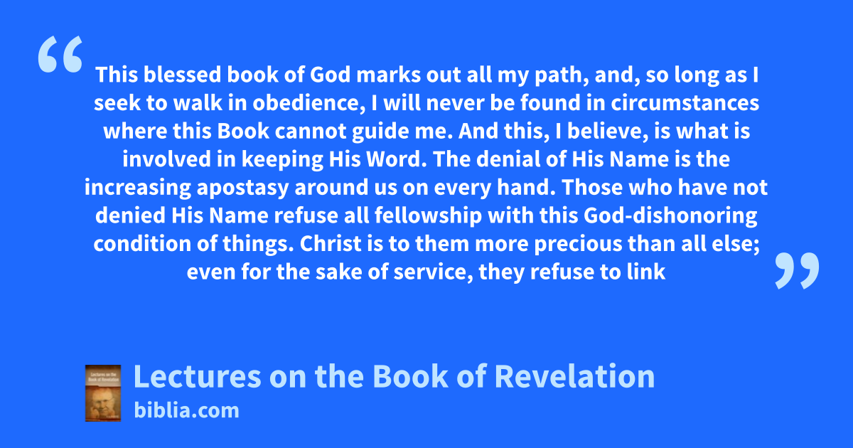 This blessed book of God marks out all my path, and, so long as I seek to walk in obedience, I will never be found in circumstances where this Book cannot guide me. And this, I believe, is what is involved in keeping His Word. The denial of His Name is the increasing apostasy around us on every hand. Those who have not denied His Name refuse all fellowship with this God-dishonoring condition of things. Christ is to them more precious than all else; even for the sake of service, they refuse to link