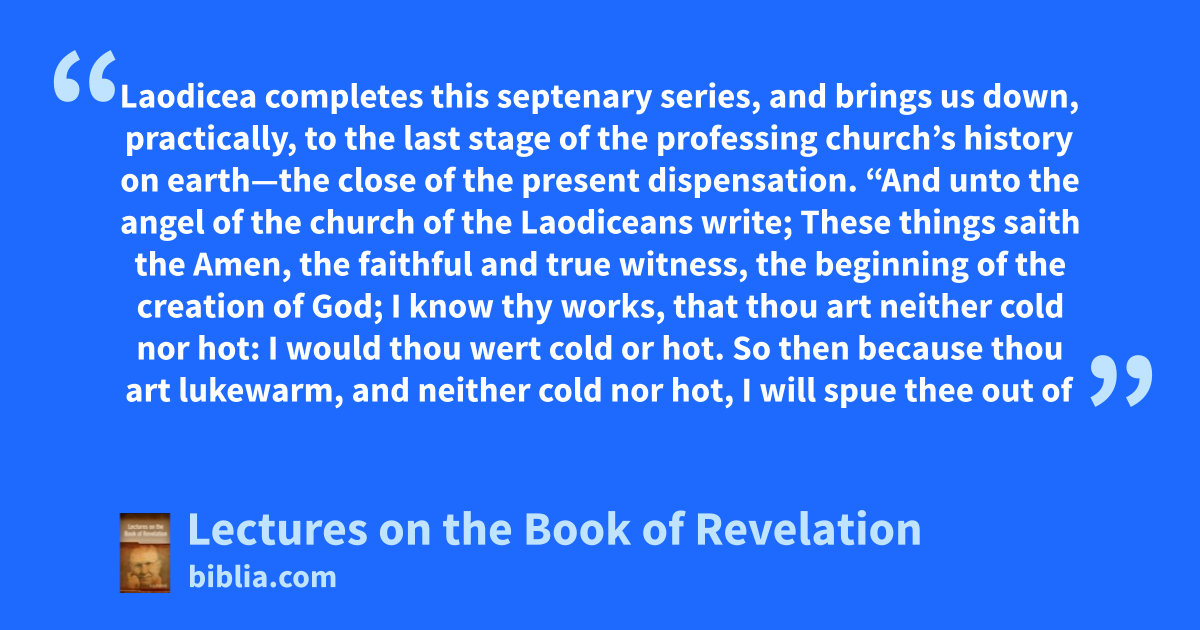 Laodicea completes this septenary series, and brings us down, practically, to the last stage of the professing church’s history on earth—the close of the present dispensation. “And unto the angel of the church of the Laodiceans write; These things saith the Amen, the faithful and true witness, the beginning of the creation of God; I know thy works, that thou art neither cold nor hot: I would thou wert cold or hot. So then because thou art lukewarm, and neither cold nor hot, I will spue thee out of