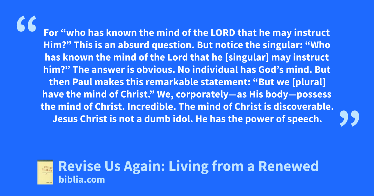 For “who has known the mind of the LORD that he may instruct Him?” This is an absurd question. But notice the singular: “Who has known the mind of the Lord that he [singular] may instruct him?” The answer is obvious. No individual has God’s mind. But then Paul makes this remarkable statement: “But we [plural] have the mind of Christ.” We, corporately—as His body—possess the mind of Christ. Incredible. The mind of Christ is discoverable. Jesus Christ is not a dumb idol. He has the power of speech.