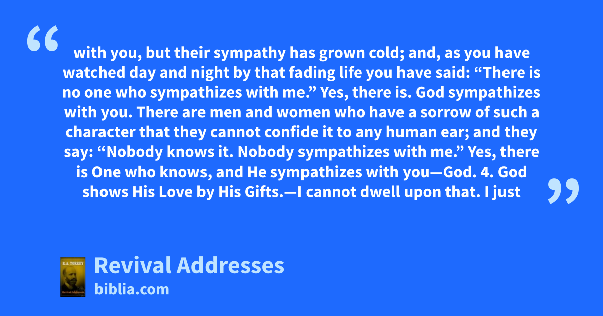 with you, but their sympathy has grown cold; and, as you have watched day and night by that fading life you have said: “There is no one who sympathizes with me.” Yes, there is. God sympathizes with you. There are men and women who have a sorrow of such a character that they cannot confide it to any human ear; and they say: “Nobody knows it. Nobody sympathizes with me.” Yes, there is One who knows, and He sympathizes with you—God. 4. God shows His Love by His Gifts.—I cannot dwell upon that. I just