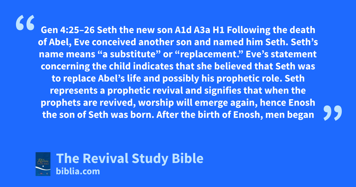 Gen 4:25–26 Seth the new son A1d A3a H1 Following the death of Abel, Eve conceived another son and named him Seth. Seth’s name means “a substitute” or “replacement.” Eve’s statement concerning the child indicates that she believed that Seth was to replace Abel’s life and possibly his prophetic role. Seth represents a prophetic revival and signifies that when the prophets are revived, worship will emerge again, hence Enosh the son of Seth was born. After the birth of Enosh, men began