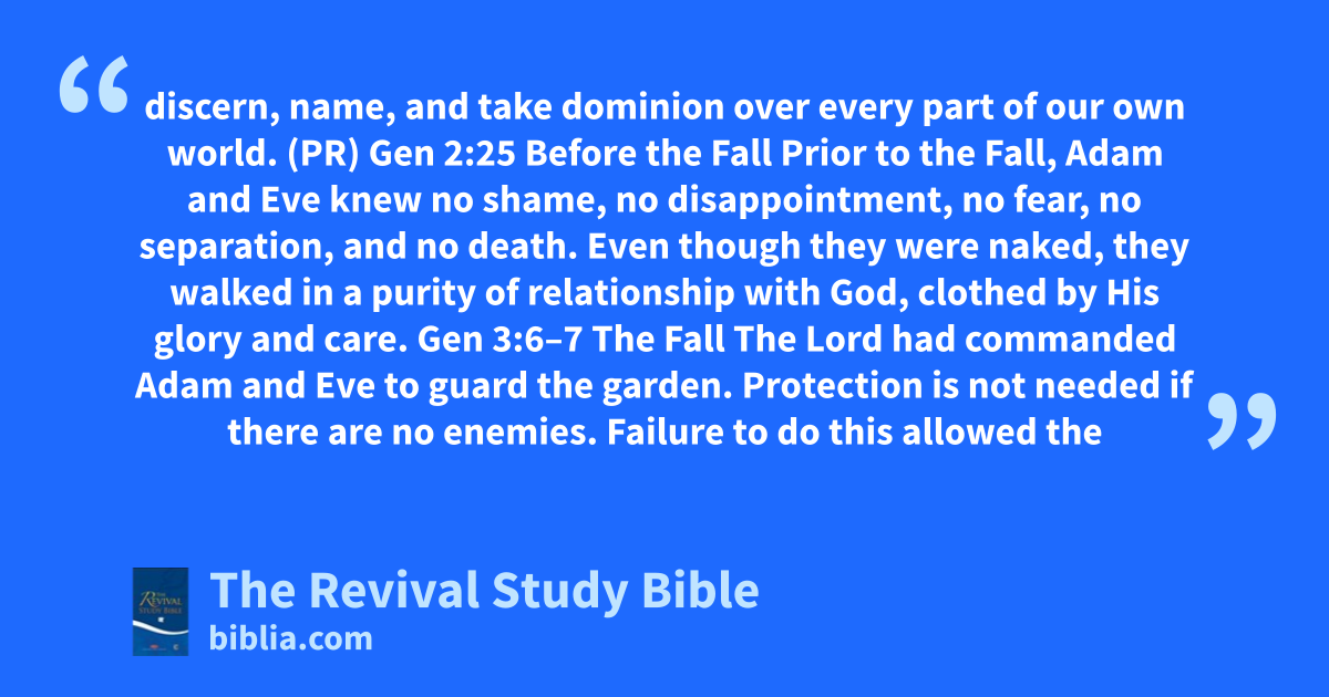 discern, name, and take dominion over every part of our own world. (PR) Gen 2:25 Before the Fall Prior to the Fall, Adam and Eve knew no shame, no disappointment, no fear, no separation, and no death. Even though they were naked, they walked in a purity of relationship with God, clothed by His glory and care. Gen 3:6–7 The Fall The Lord had commanded Adam and Eve to guard the garden. Protection is not needed if there are no enemies. Failure to do this allowed the