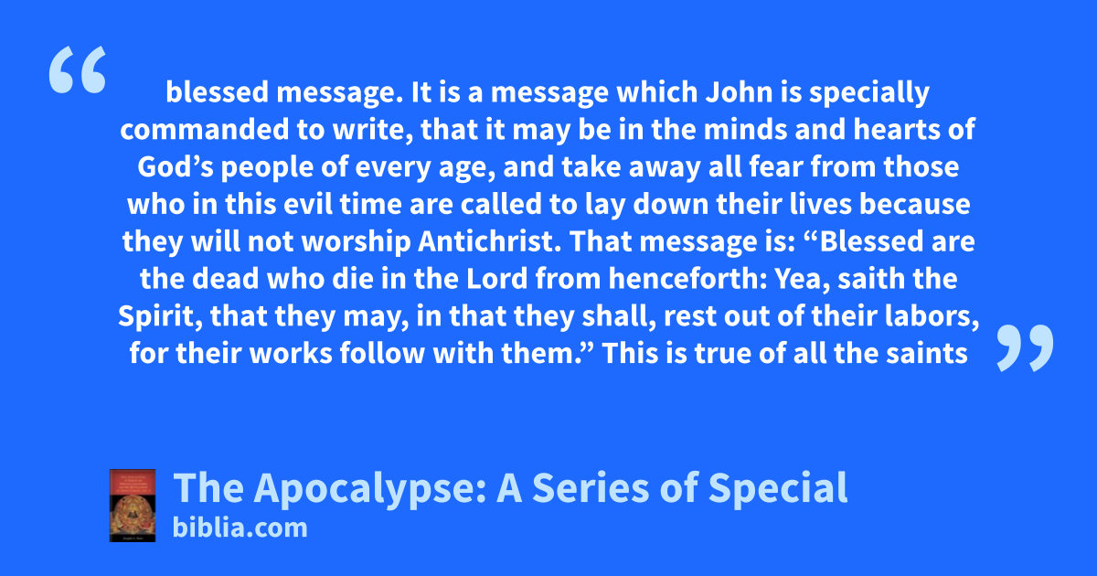 blessed message. It is a message which John is specially commanded to write, that it may be in the minds and hearts of God’s people of every age, and take away all fear from those who in this evil time are called to lay down their lives because they will not worship Antichrist. That message is: “Blessed are the dead who die in the Lord from henceforth: Yea, saith the Spirit, that they may, in that they shall, rest out of their labors, for their works follow with them.” This is true of all the saints