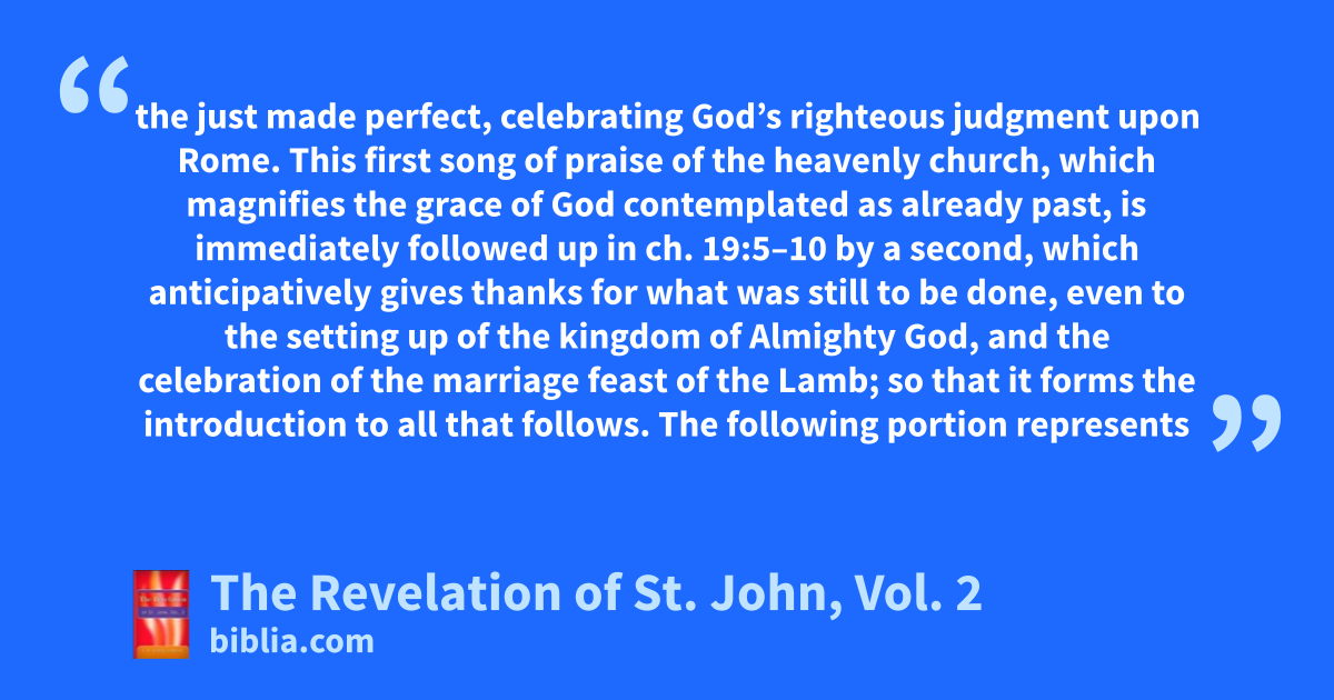 the just made perfect, celebrating God’s righteous judgment upon Rome. This first song of praise of the heavenly church, which magnifies the grace of God contemplated as already past, is immediately followed up in ch. 19:5–10 by a second, which anticipatively gives thanks for what was still to be done, even to the setting up of the kingdom of Almighty God, and the celebration of the marriage feast of the Lamb; so that it forms the introduction to all that follows. The following portion represents