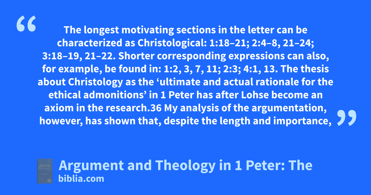 The longest motivating sections in the letter can be characterized as Christological: 1:18–21; 2:4–8, 21–24; 3:18–19, 21–22. Shorter corresponding expressions can also, for example, be found in: 1:2, 3, 7, 11; 2:3; 4:1, 13. The thesis about Christology as the ‘ultimate and actual rationale for the ethical admonitions’ in 1 Peter has after Lohse become an axiom in the research.36 My analysis of the argumentation, however, has shown that, despite the length and importance,