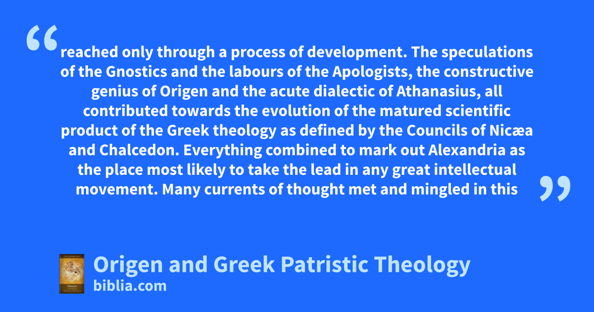 reached only through a process of development. The speculations of the Gnostics and the labours of the Apologists, the constructive genius of Origen and the acute dialectic of Athanasius, all contributed towards the evolution of the matured scientific product of the Greek theology as defined by the Councils of Nicæa and Chalcedon. Everything combined to mark out Alexandria as the place most likely to take the lead in any great intellectual movement. Many currents of thought met and mingled in this