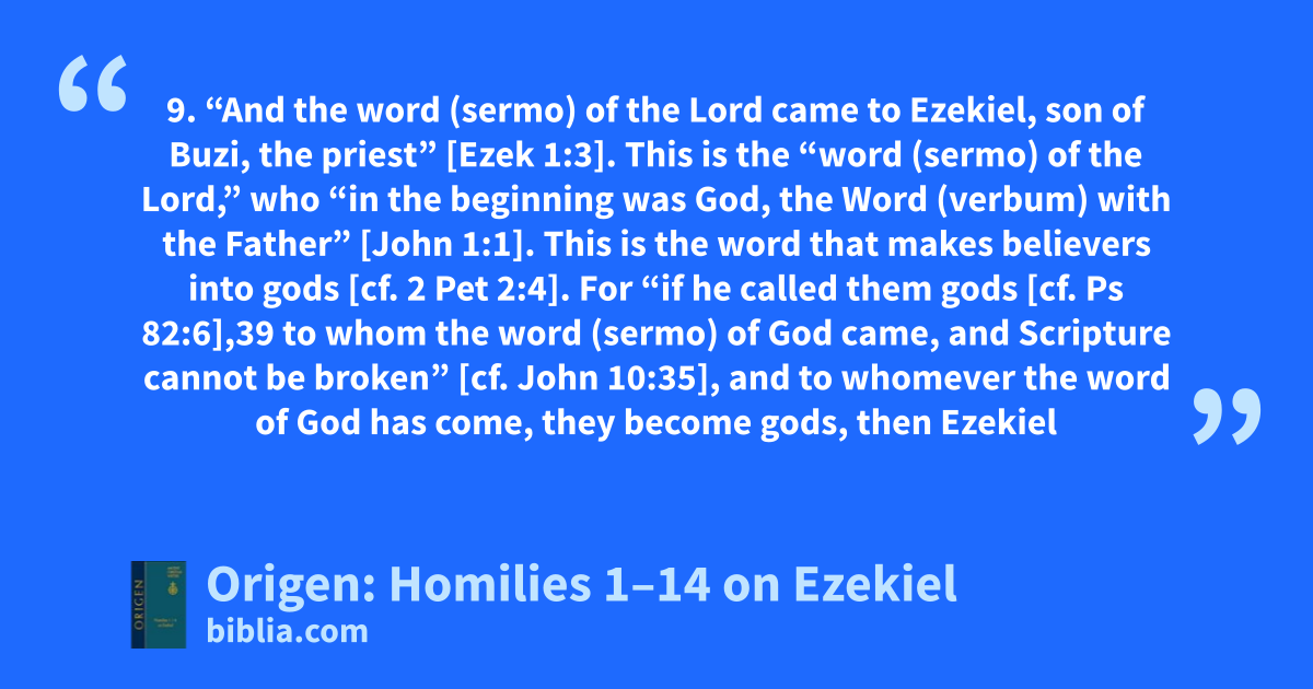 9. “And the word (sermo) of the Lord came to Ezekiel, son of Buzi, the priest” [Ezek 1:3]. This is the “word (sermo) of the Lord,” who “in the beginning was God, the Word (verbum) with the Father” [John 1:1]. This is the word that makes believers into gods [cf. 2 Pet 2:4]. For “if he called them gods [cf. Ps 82:6],39 to whom the word (sermo) of God came, and Scripture cannot be broken” [cf. John 10:35], and to whomever the word of God has come, they become gods, then Ezekiel