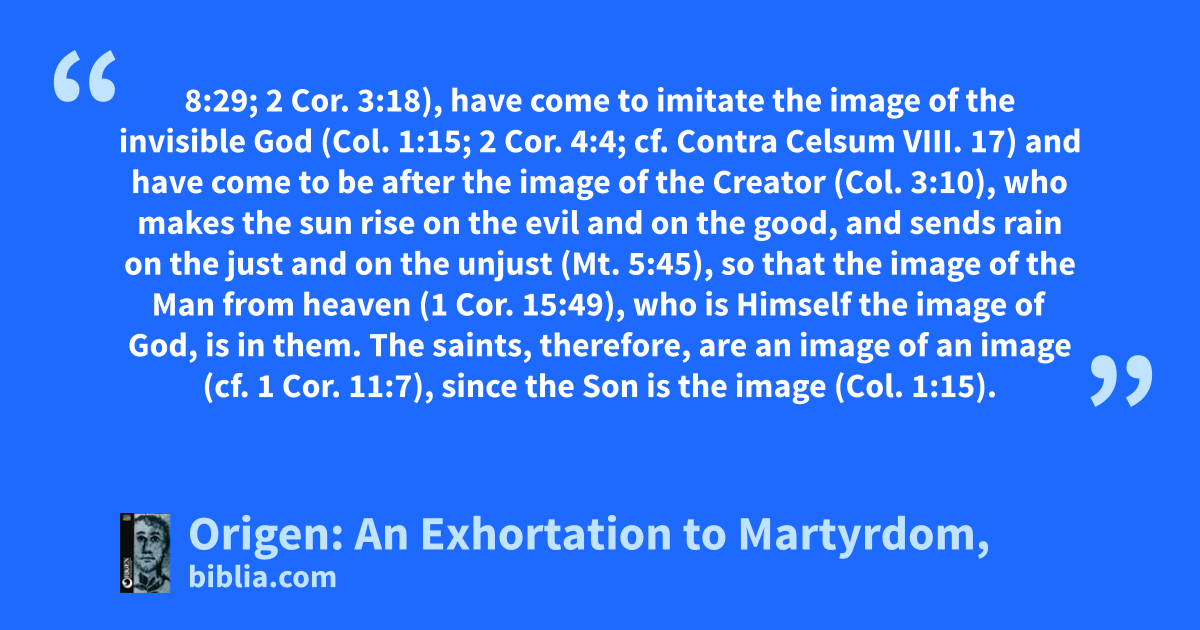 8:29; 2 Cor. 3:18), have come to imitate the image of the invisible God (Col. 1:15; 2 Cor. 4:4; cf. Contra Celsum VIII. 17) and have come to be after the image of the Creator (Col. 3:10), who makes the sun rise on the evil and on the good, and sends rain on the just and on the unjust (Mt. 5:45), so that the image of the Man from heaven (1 Cor. 15:49), who is Himself the image of God, is in them. The saints, therefore, are an image of an image (cf. 1 Cor. 11:7), since the Son is the image (Col. 1:15).