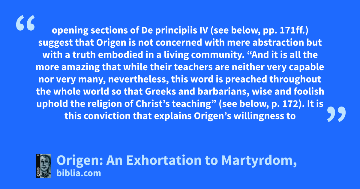 opening sections of De principiis IV (see below, pp. 171ff.) suggest that Origen is not concerned with mere abstraction but with a truth embodied in a living community. “And it is all the more amazing that while their teachers are neither very capable nor very many, nevertheless, this word is preached throughout the whole world so that Greeks and barbarians, wise and foolish uphold the religion of Christ’s teaching” (see below, p. 172). It is this conviction that explains Origen’s willingness to