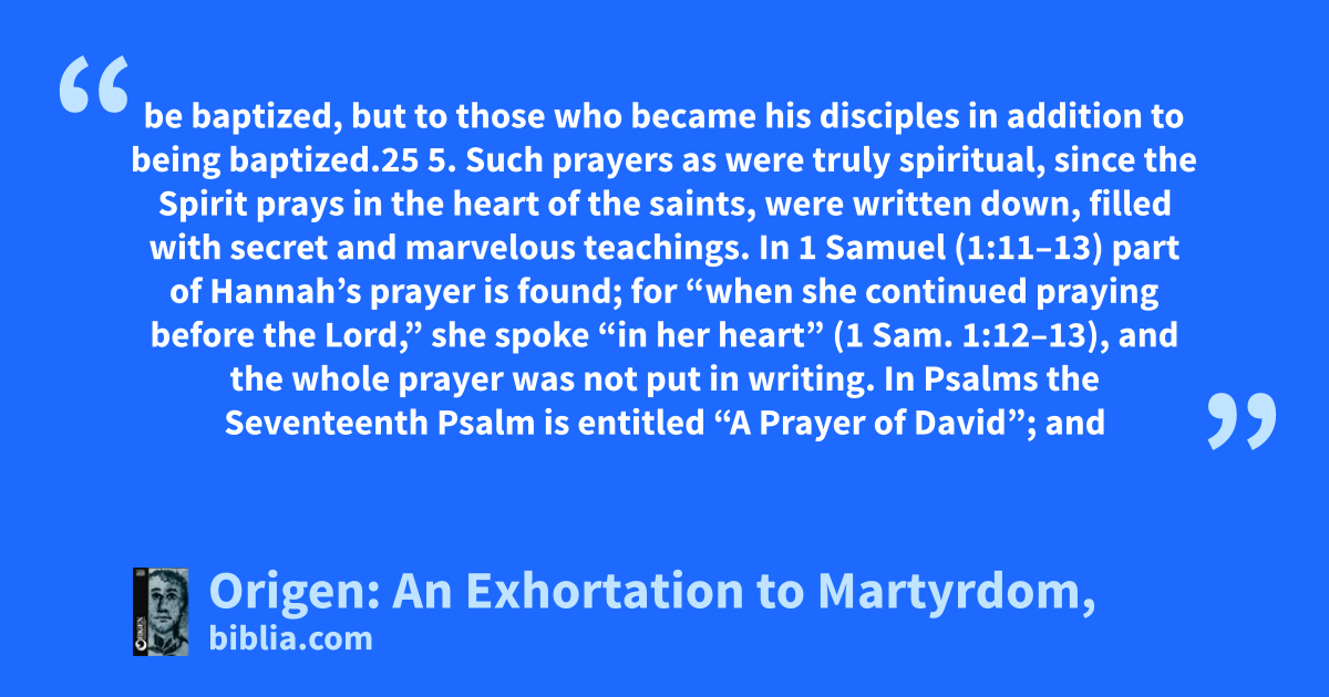 be baptized, but to those who became his disciples in addition to being baptized.25 5. Such prayers as were truly spiritual, since the Spirit prays in the heart of the saints, were written down, filled with secret and marvelous teachings. In 1 Samuel (1:11–13) part of Hannah’s prayer is found; for “when she continued praying before the Lord,” she spoke “in her heart” (1 Sam. 1:12–13), and the whole prayer was not put in writing. In Psalms the Seventeenth Psalm is entitled “A Prayer of David”; and