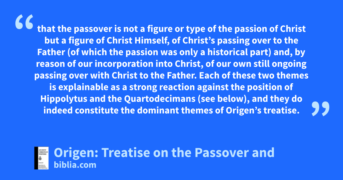 that the passover is not a figure or type of the passion of Christ but a figure of Christ Himself, of Christ’s passing over to the Father (of which the passion was only a historical part) and, by reason of our incorporation into Christ, of our own still ongoing passing over with Christ to the Father. Each of these two themes is explainable as a strong reaction against the position of Hippolytus and the Quartodecimans (see below), and they do indeed constitute the dominant themes of Origen’s treatise.