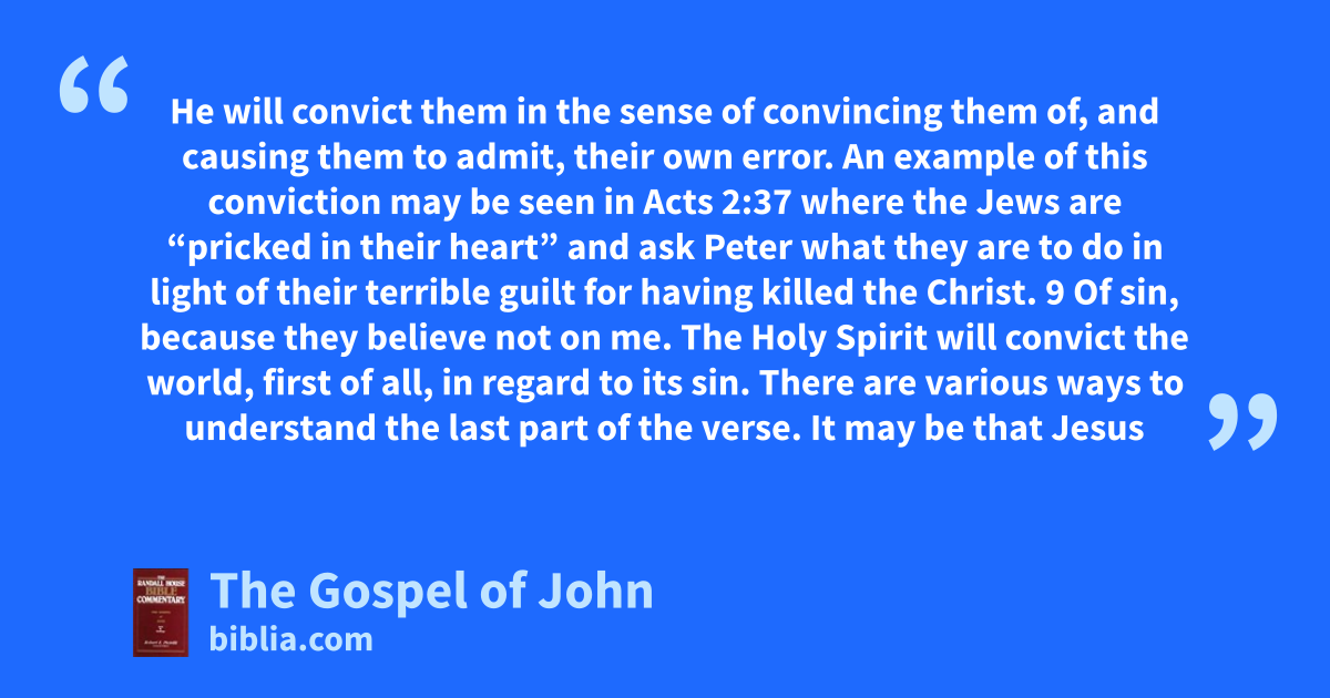 He will convict them in the sense of convincing them of, and causing them to admit, their own error. An example of this conviction may be seen in Acts 2:37 where the Jews are “pricked in their heart” and ask Peter what they are to do in light of their terrible guilt for having killed the Christ. 9 Of sin, because they believe not on me. The Holy Spirit will convict the world, first of all, in regard to its sin. There are various ways to understand the last part of the verse. It may be that Jesus