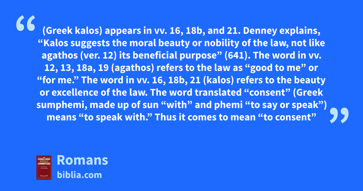 (Greek kalos) appears in vv. 16, 18b, and 21. Denney explains, “Kalos suggests the moral beauty or nobility of the law, not like agathos (ver. 12) its beneficial purpose” (641). The word in vv. 12, 13, 18a, 19 (agathos) refers to the law as “good to me” or “for me.” The word in vv. 16, 18b, 21 (kalos) refers to the beauty or excellence of the law. The word translated “consent” (Greek sumphemi, made up of sun “with” and phemi “to say or speak”) means “to speak with.” Thus it comes to mean “to consent”