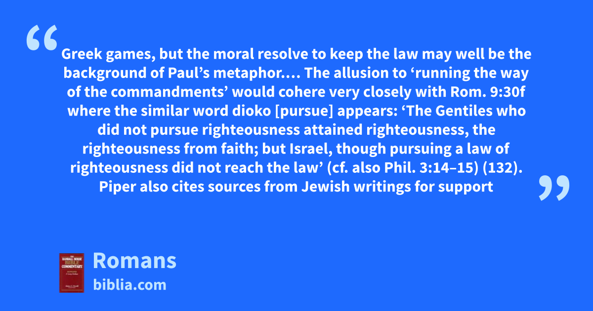 Greek games, but the moral resolve to keep the law may well be the background of Paul’s metaphor.… The allusion to ‘running the way of the commandments’ would cohere very closely with Rom. 9:30f where the similar word dioko [pursue] appears: ‘The Gentiles who did not pursue righteousness attained righteousness, the righteousness from faith; but Israel, though pursuing a law of righteousness did not reach the law’ (cf. also Phil. 3:14–15) (132). Piper also cites sources from Jewish writings for support