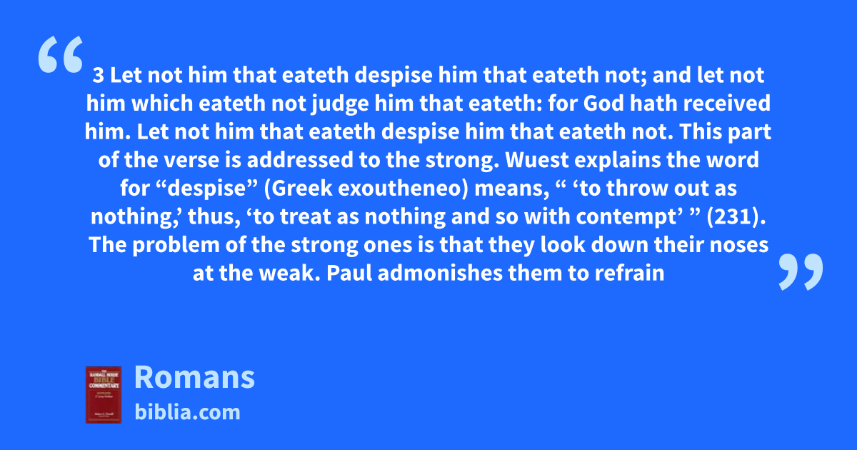 3 Let not him that eateth despise him that eateth not; and let not him which eateth not judge him that eateth: for God hath received him. Let not him that eateth despise him that eateth not. This part of the verse is addressed to the strong. Wuest explains the word for “despise” (Greek exoutheneo) means, “ ‘to throw out as nothing,’ thus, ‘to treat as nothing and so with contempt’ ” (231). The problem of the strong ones is that they look down their noses at the weak. Paul admonishes them to refrain