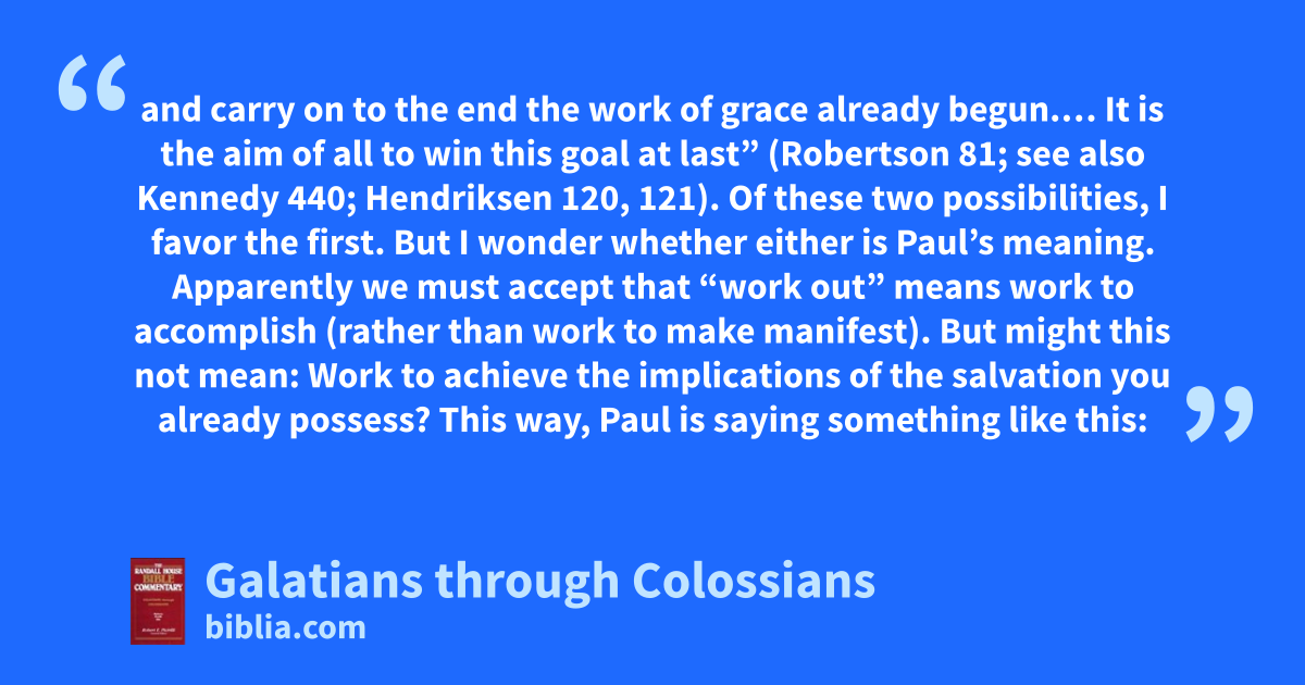 and carry on to the end the work of grace already begun.… It is the aim of all to win this goal at last” (Robertson 81; see also Kennedy 440; Hendriksen 120, 121). Of these two possibilities, I favor the first. But I wonder whether either is Paul’s meaning. Apparently we must accept that “work out” means work to accomplish (rather than work to make manifest). But might this not mean: Work to achieve the implications of the salvation you already possess? This way, Paul is saying something like this: