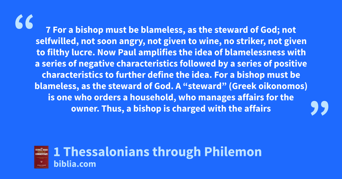 7 For a bishop must be blameless, as the steward of God; not selfwilled, not soon angry, not given to wine, no striker, not given to filthy lucre. Now Paul amplifies the idea of blamelessness with a series of negative characteristics followed by a series of positive characteristics to further define the idea. For a bishop must be blameless, as the steward of God. A “steward” (Greek oikonomos) is one who orders a household, who manages affairs for the owner. Thus, a bishop is charged with the affairs