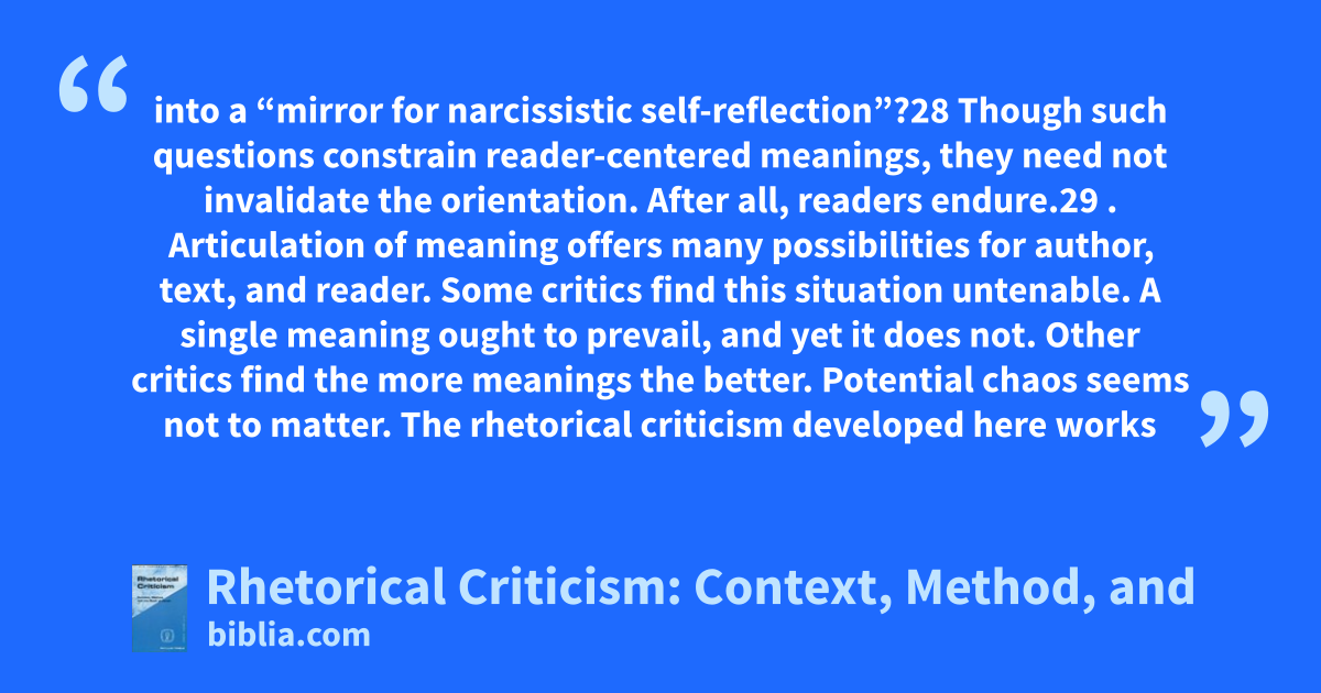 into a “mirror for narcissistic self-reflection”?28 Though such questions constrain reader-centered meanings, they need not invalidate the orientation. After all, readers endure.29 . Articulation of meaning offers many possibilities for author, text, and reader. Some critics find this situation untenable. A single meaning ought to prevail, and yet it does not. Other critics find the more meanings the better. Potential chaos seems not to matter. The rhetorical criticism developed here works
