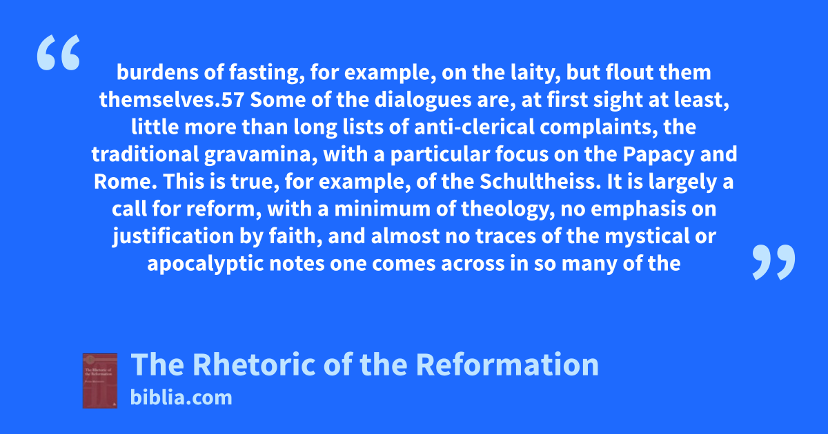 burdens of fasting, for example, on the laity, but flout them themselves.57 Some of the dialogues are, at first sight at least, little more than long lists of anti-clerical complaints, the traditional gravamina, with a particular focus on the Papacy and Rome. This is true, for example, of the Schultheiss. It is largely a call for reform, with a minimum of theology, no emphasis on justification by faith, and almost no traces of the mystical or apocalyptic notes one comes across in so many of the