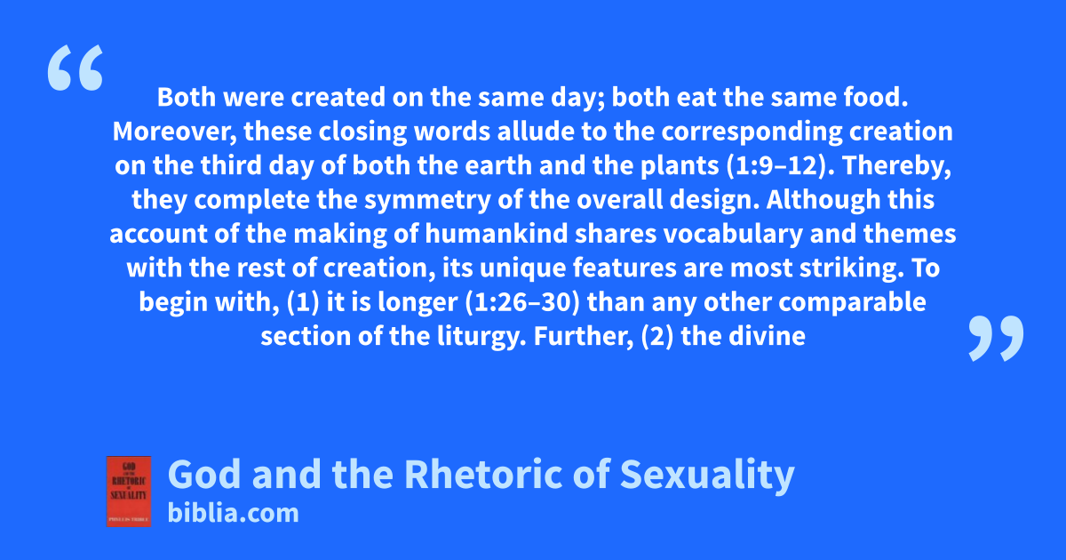 Both were created on the same day; both eat the same food. Moreover, these closing words allude to the corresponding creation on the third day of both the earth and the plants (1:9–12). Thereby, they complete the symmetry of the overall design. Although this account of the making of humankind shares vocabulary and themes with the rest of creation, its unique features are most striking. To begin with, (1) it is longer (1:26–30) than any other comparable section of the liturgy. Further, (2) the divine