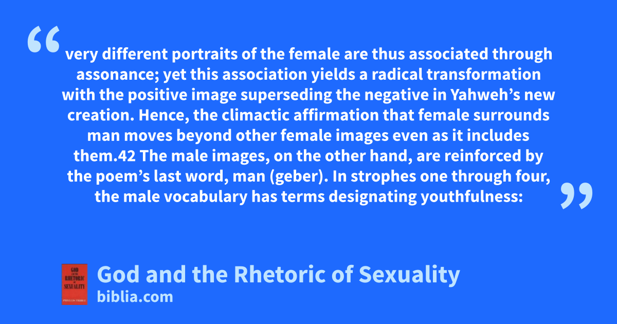 very different portraits of the female are thus associated through assonance; yet this association yields a radical transformation with the positive image superseding the negative in Yahweh’s new creation. Hence, the climactic affirmation that female surrounds man moves beyond other female images even as it includes them.42 The male images, on the other hand, are reinforced by the poem’s last word, man (geber). In strophes one through four, the male vocabulary has terms designating youthfulness: