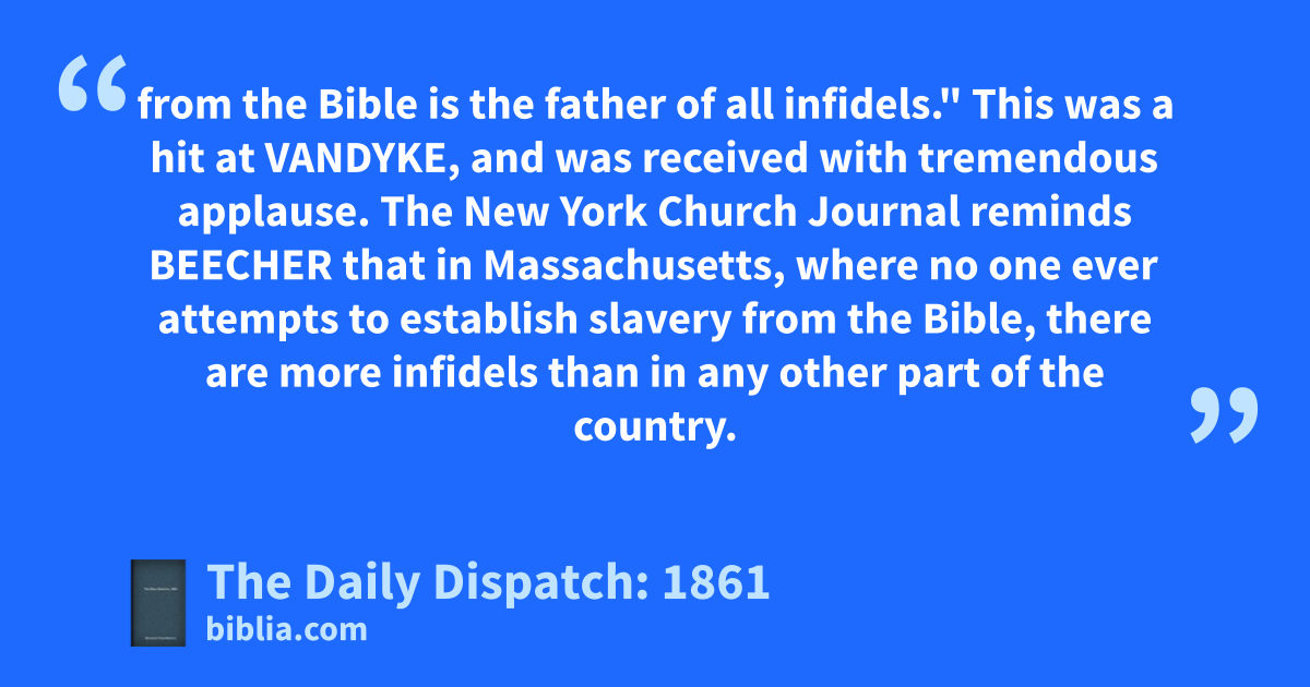 from the Bible is the father of all infidels." This was a hit at VANDYKE, and was received with tremendous applause. The New York Church Journal reminds BEECHER that in Massachusetts, where no one ever attempts to establish slavery from the Bible, there are more infidels than in any other part of the country.