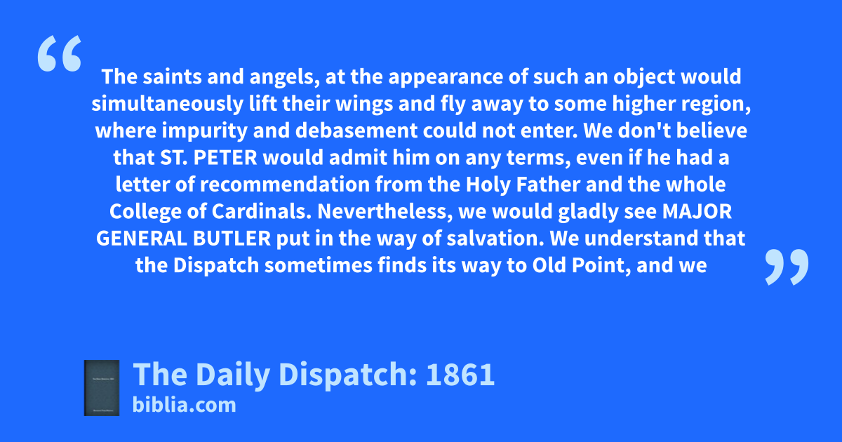 The saints and angels, at the appearance of such an object would simultaneously lift their wings and fly away to some higher region, where impurity and debasement could not enter. We don't believe that ST. PETER would admit him on any terms, even if he had a letter of recommendation from the Holy Father and the whole College of Cardinals. Nevertheless, we would gladly see MAJOR GENERAL BUTLER put in the way of salvation. We understand that the Dispatch sometimes finds its way to Old Point, and we