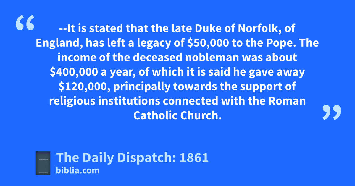 --It is stated that the late Duke of Norfolk, of England, has left a legacy of $50,000 to the Pope. The income of the deceased nobleman was about $400,000 a year, of which it is said he gave away $120,000, principally towards the support of religious institutions connected with the Roman Catholic Church.