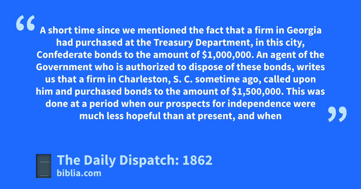 A short time since we mentioned the fact that a firm in Georgia had purchased at the Treasury Department, in this city, Confederate bonds to the amount of $1,000,000. An agent of the Government who is authorized to dispose of these bonds, writes us that a firm in Charleston, S. C. sometime ago, called upon him and purchased bonds to the amount of $1,500,000. This was done at a period when our prospects for independence were much less hopeful than at present, and when
