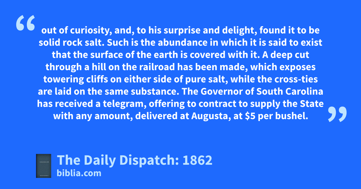 out of curiosity, and, to his surprise and delight, found it to be solid rock salt. Such is the abundance in which it is said to exist that the surface of the earth is covered with it. A deep cut through a hill on the railroad has been made, which exposes towering cliffs on either side of pure salt, while the cross-ties are laid on the same substance. The Governor of South Carolina has received a telegram, offering to contract to supply the State with any amount, delivered at Augusta, at $5 per bushel.