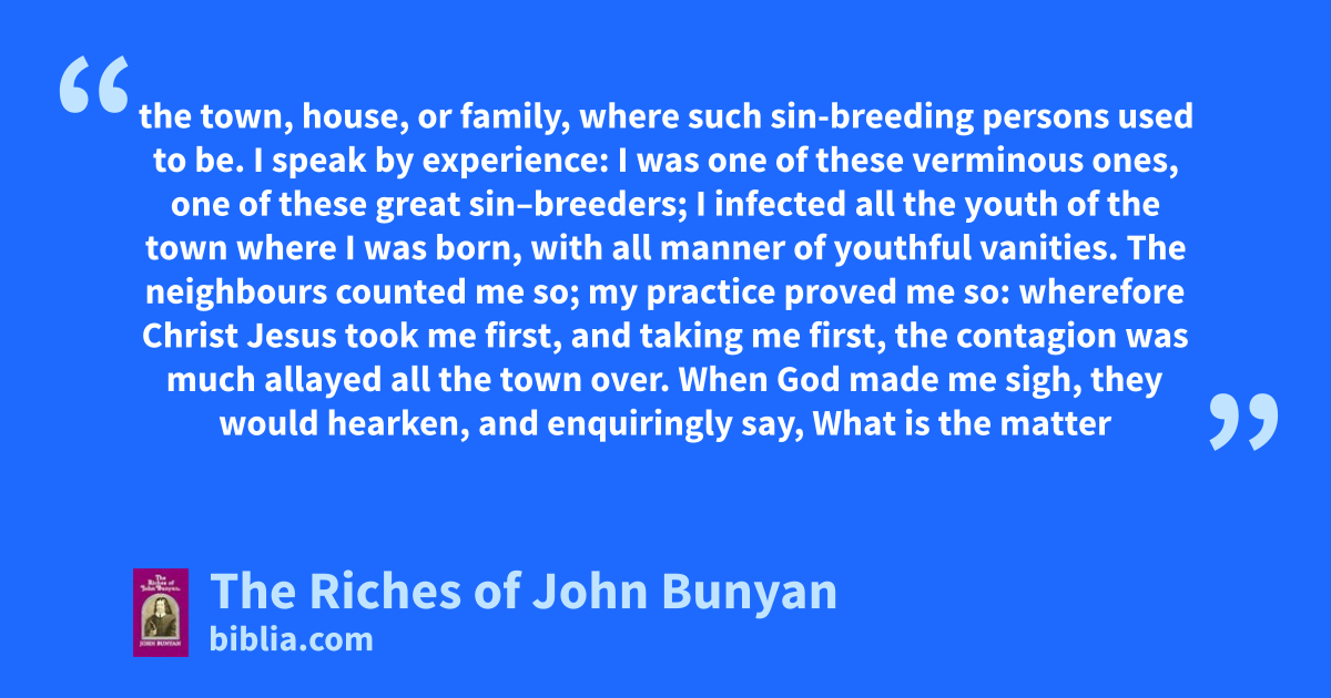 the town, house, or family, where such sin-breeding persons used to be. I speak by experience: I was one of these verminous ones, one of these great sin–breeders; I infected all the youth of the town where I was born, with all manner of youthful vanities. The neighbours counted me so; my practice proved me so: wherefore Christ Jesus took me first, and taking me first, the contagion was much allayed all the town over. When God made me sigh, they would hearken, and enquiringly say, What is the matter
