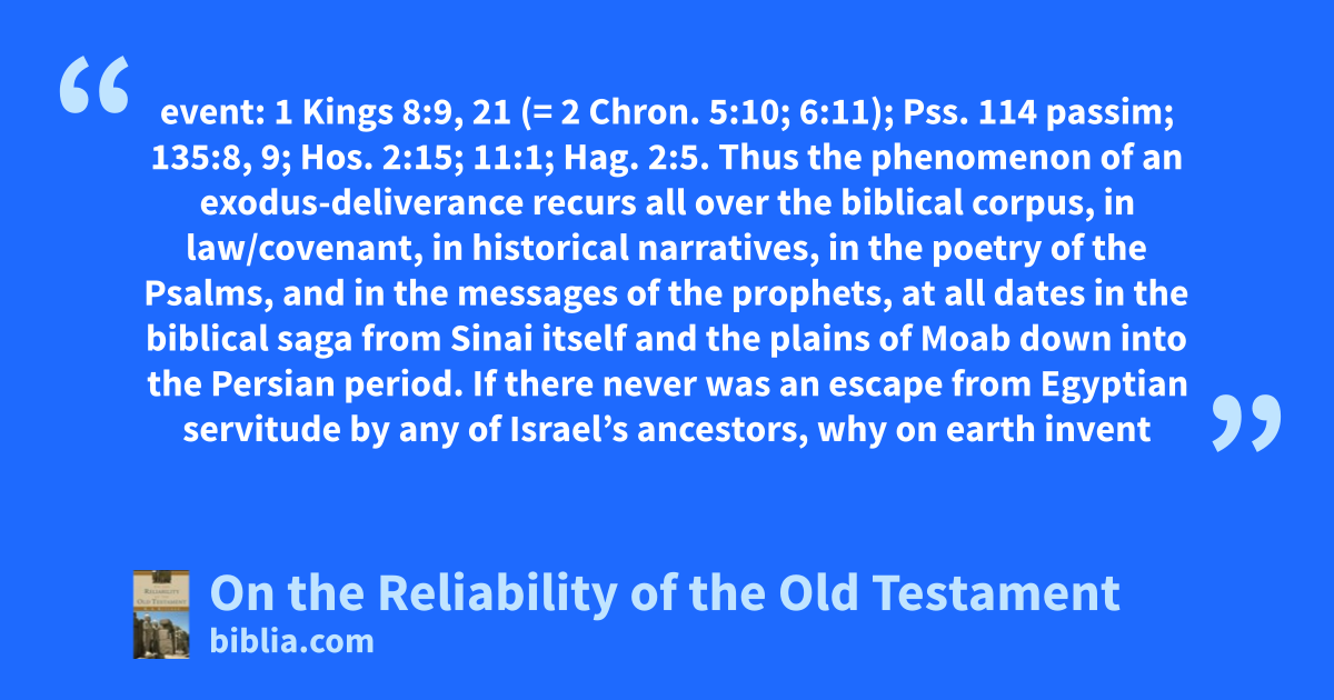 event: 1 Kings 8:9, 21 (= 2 Chron. 5:10; 6:11); Pss. 114 passim; 135:8, 9; Hos. 2:15; 11:1; Hag. 2:5. Thus the phenomenon of an exodus-deliverance recurs all over the biblical corpus, in law/covenant, in historical narratives, in the poetry of the Psalms, and in the messages of the prophets, at all dates in the biblical saga from Sinai itself and the plains of Moab down into the Persian period. If there never was an escape from Egyptian servitude by any of Israel’s ancestors, why on earth invent