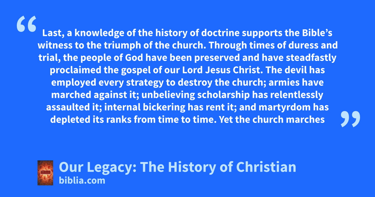 Last, a knowledge of the history of doctrine supports the Bible’s witness to the triumph of the church. Through times of duress and trial, the people of God have been preserved and have steadfastly proclaimed the gospel of our Lord Jesus Christ. The devil has employed every strategy to destroy the church; armies have marched against it; unbelieving scholarship has relentlessly assaulted it; internal bickering has rent it; and martyrdom has depleted its ranks from time to time. Yet the church marches